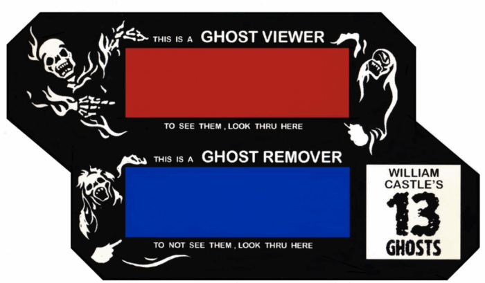 13 Ghosts came after Castle’s two biggest hits, House on Haunted Hill (1959) and The Tingler (1959), and proved to be another notch in his belt. The gimmick this time was “Illusion-O”: audiences were given red and blue cellophane glasses (similar to 3D glasses). Looking through the red filter intensified the images of the ghosts, while the blue filter made them disappear. So, if you were a big scaredy-cat, you could choose to see nothing. Who the Hell would pay to see a movie called 13 Ghosts and choose not to see the ghosts?